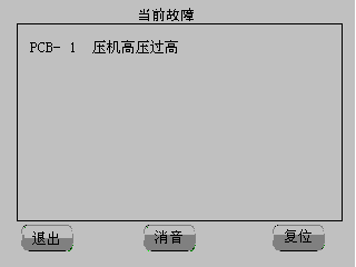 正常情況下“故障查詢”按鍵隱藏,當(dāng)出現(xiàn)新故障時(shí),運(yùn)行主接口“故障查詢”按鍵閃爍并報(bào)警,按“故障查詢”鍵后進(jìn)入故障查詢界面,如上圖4-10所示。在故障查詢界面按“消音”鍵停止報(bào)警,確認(rèn)故障排除后可按“復(fù)位”鍵使機(jī)組復(fù)位。